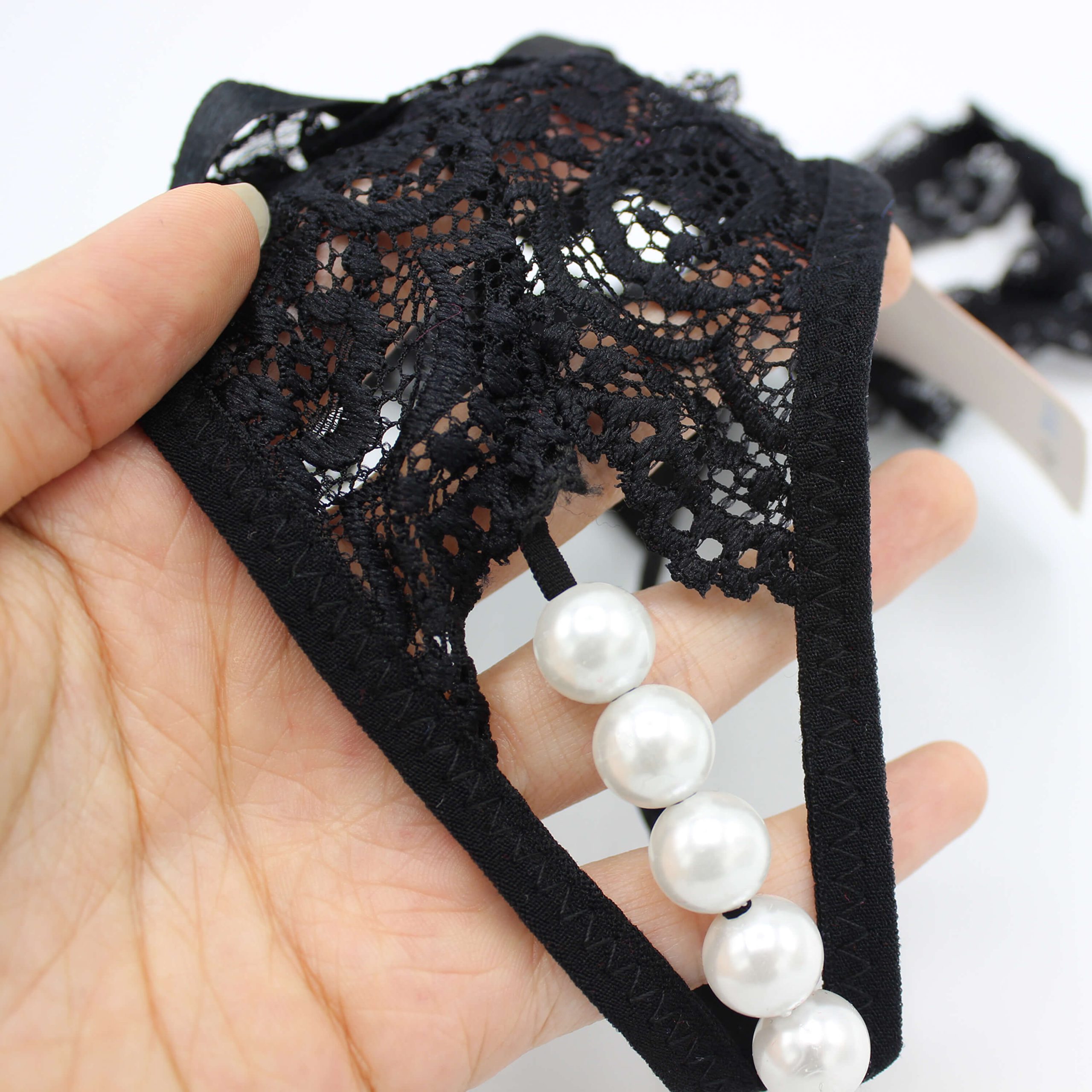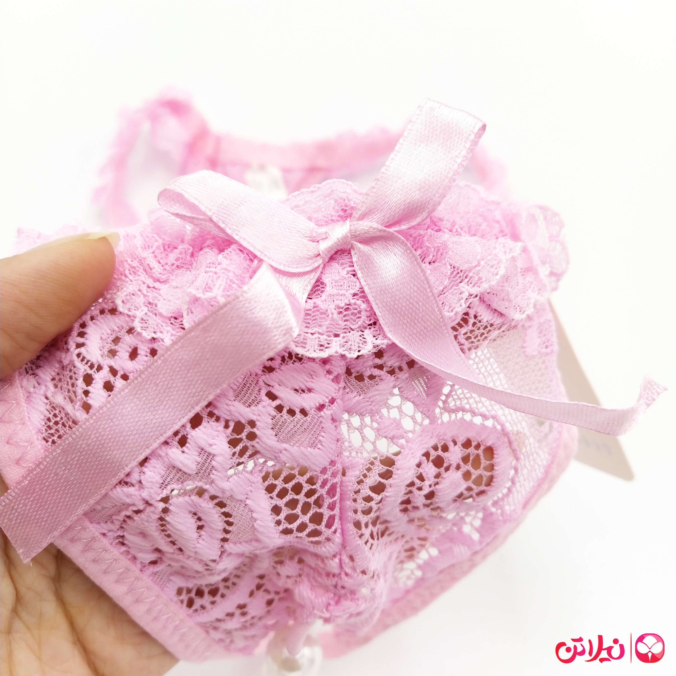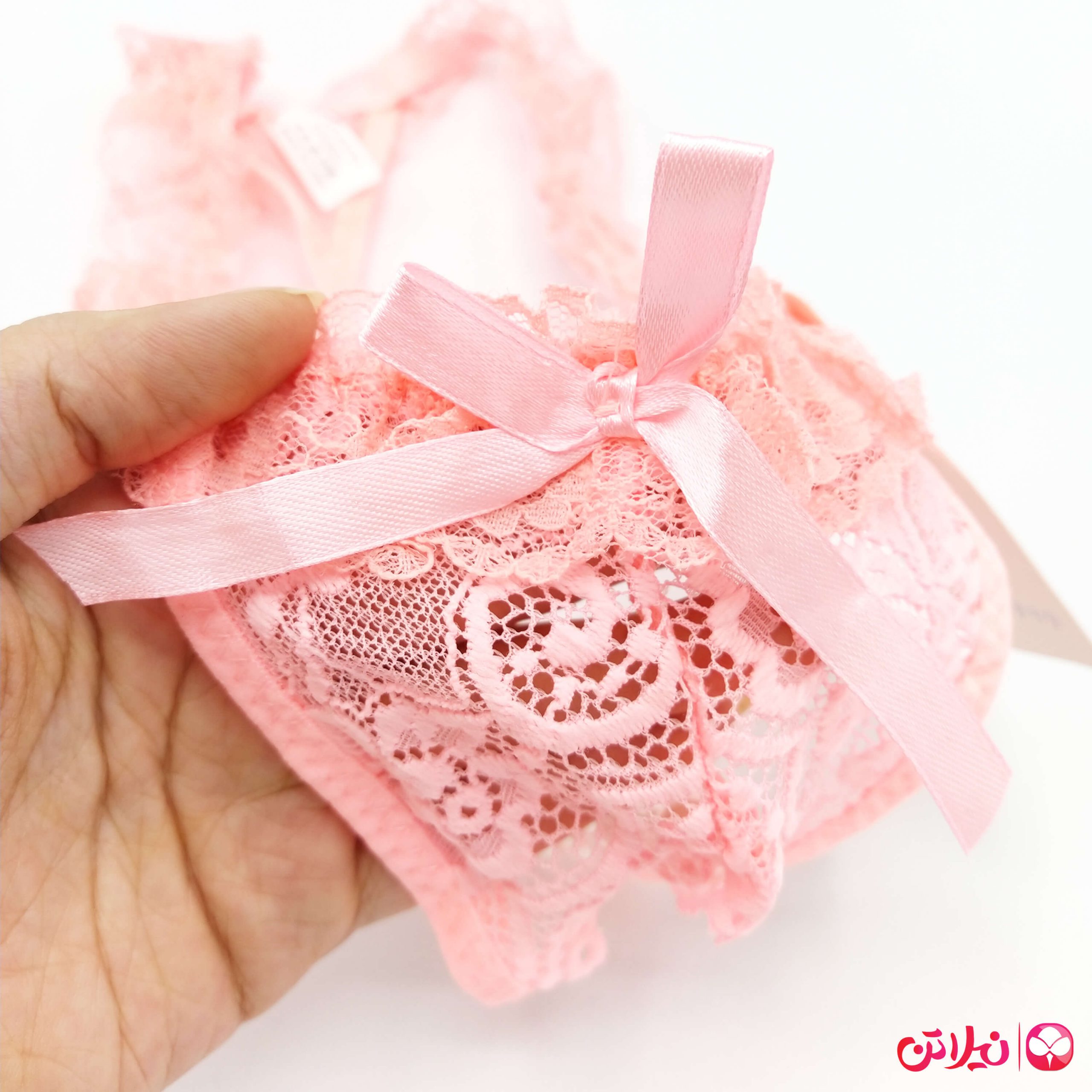 برای زیبایی بیشتر، دور کمر آن تنها ترکیبی از کش، تور و گیپور می باشد. در قسمت جلوی این محصول، یک رشته مروارید به همراه پوشش گیپور کار شده است.
